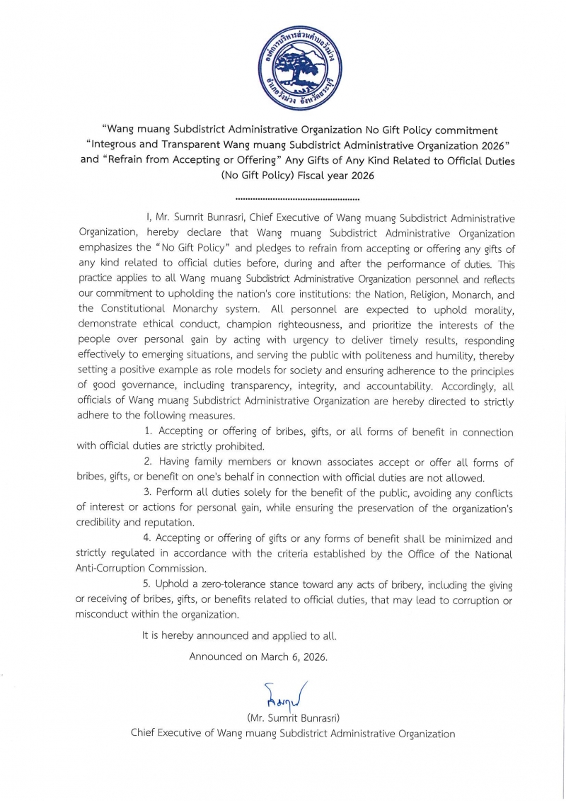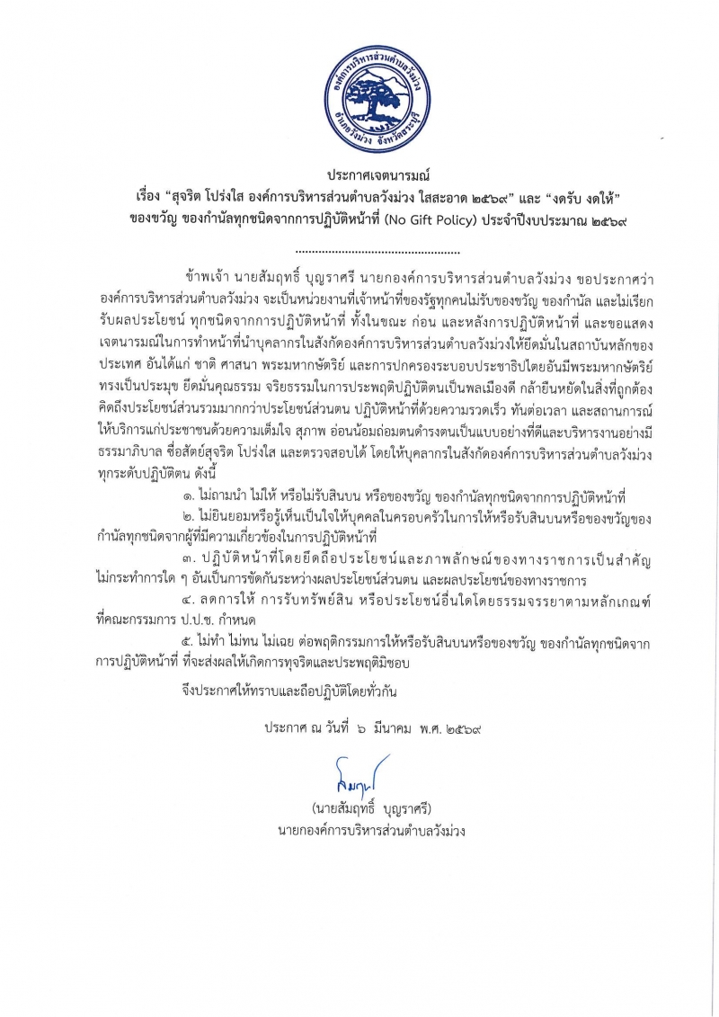 นายสัมฤทธิ์ บุญราศรี นายกองค์การบริหารส่วนตำบลวังม่วง ประกาศนโยบาย ไม่รับของขวัญและของกำนัลจากการปฏิบัติหน้าที่ (No Gift Policy) ทั้งก่อน ขณะ และหลังปฏิบัติหน้าที่ในทุกโอกาสและทุกเทศกาล |