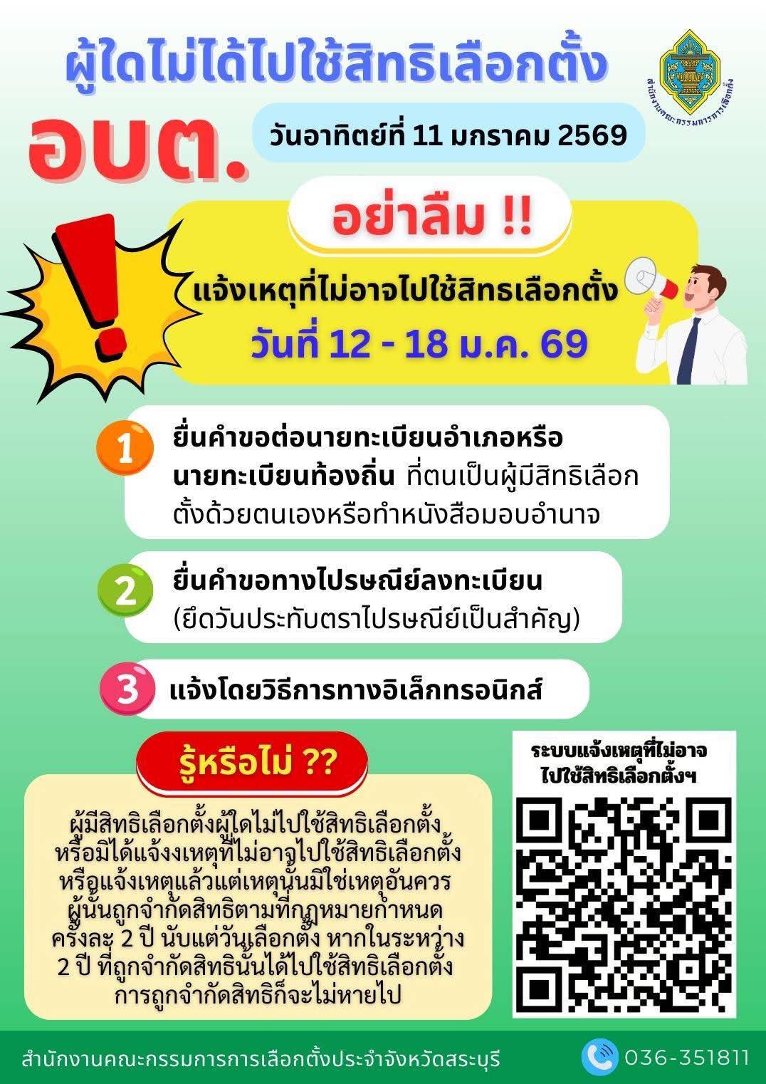 📣 ประชาสัมพันธ์ถึงผู้มีสิทธิเลือกตั้ง อบต. 🗓 แจ้งเหตุได้ระหว่างวันที่ 12 – 18 มกราคม 2569