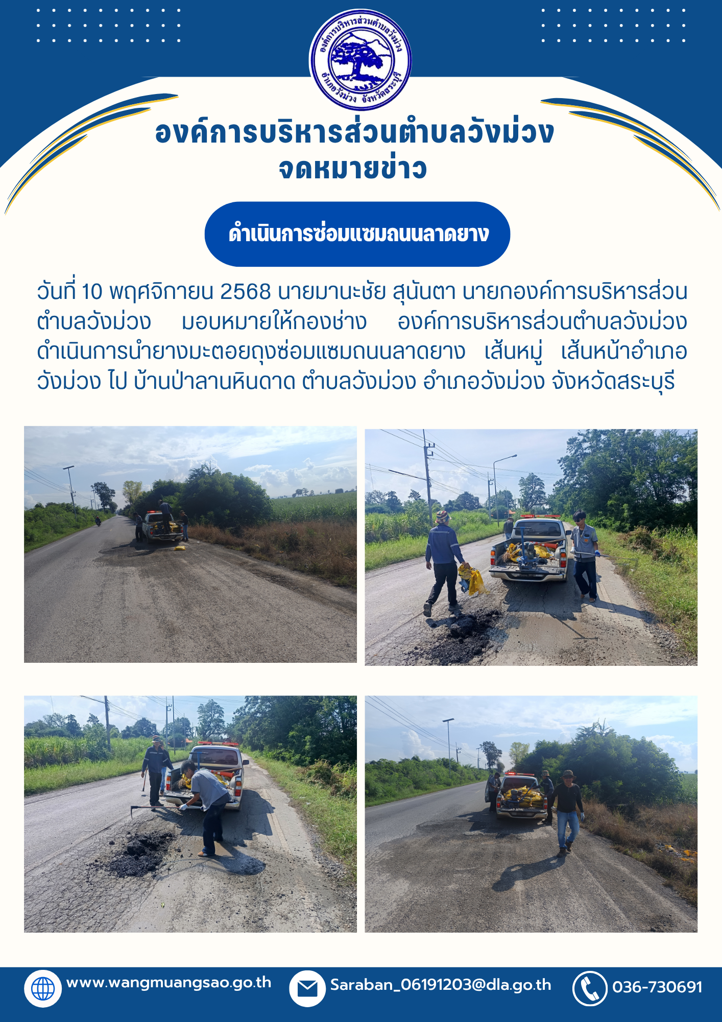 วันที่ 10 พฤศจิกายน 2568 นายมานะชัย สุนันตา นายกองค์การบริหารส่วนตำบลวังม่วง มอบหมายให้กองช่าง องค์การบริหารส่วนตำบลวังม่วง ดำเนินการนำยางมะตอยถุงซ่อมแซมถนนลาดยาง เส้นหมู่ เส้นหน้าอำเภอวังม่วง ไป บ้านป่าลานหินดาด ตำบลวังม่วง อำเภอวังม่วง จังหวัดสระบุรี |