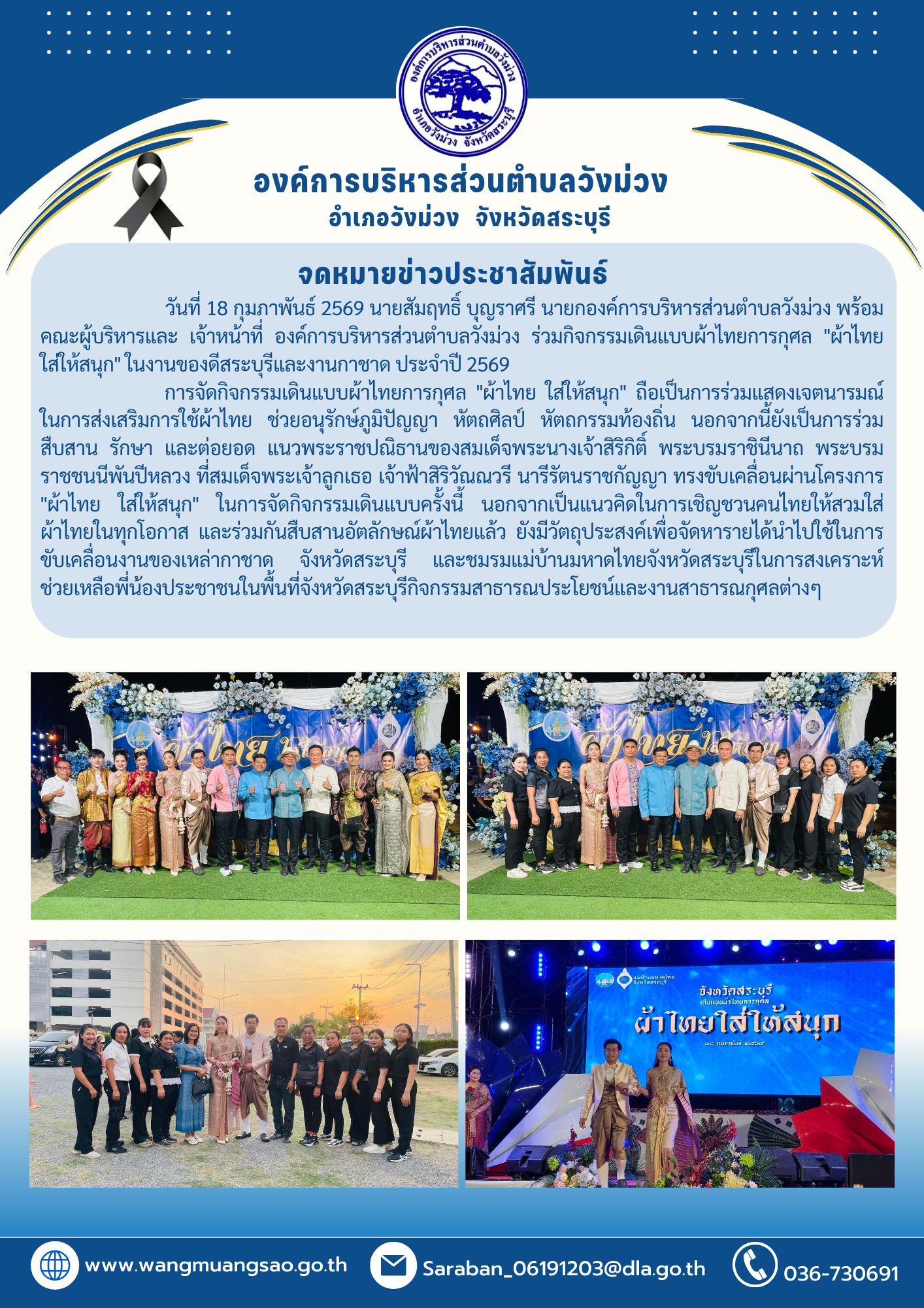 วันที่ 18 กุมภาพันธ์ 2569 นายสัมฤทธิ์ บุญราศรี นายกองค์การบริหารส่วนตำบลวังม่วง พร้อมคณะและ เจ้าหน้าที่ องค์การบริหารส่วนตำบลวังม่วง ร่วมกิจกรรมเดินแบบผ้าไทยการกุศล "ผ้าไทย ใส่ให้สนุก" ในงานของดีสระบุรีและงานกาชาด ประจำปี 2569 การจัดกิจกรรมเดินแบบผ้าไทยการกุศล "ผ้าไทย ใส่ให้สนุก" ถือเป็นการร่วมแสดงเจตนารมณ์ ในการส่งเสริมการใช้ผ้าไทย ช่วยอนุรักษ์ภูมิปัญญา หัตถศิลป์ หัตถกรรมท้องถิ่น นอกจากนี้ยังเป็นการร่วมสืบสาน รักษา และต่อยอด แนวพระราชปณิธานของสมเด็จพระนางเจ้าสิริกิติ์ พระบรมราชินีนาถ พระบรม ราชชนนีพันปีหลวง ที่สมเด็จพระเจ้าลูกเธอ เจ้าฟ้าสิริวัณณวรี นารีรัตนราชกัญญา ทรงขับเคลื่อนผ่านโครงการ "ผ้าไทย ใส่ให้สนุก" ในการจัดกิจกรรมเดินแบบครั้งนี้ นอกจากเป็นแนวคิดในการเชิญชวนคนไทยให้สวมใส่ผ้าไทยในทุกโอกาส และร่วมกันสืบสานอัตลักษณ์ผ้าไทยแล้ว ยังมีวัตถุประสงค์เพื่อจัดหารายได้นำไปใช้ในการขับเคลื่อนงานของเหล่ากาชาด จังหวัดสระบุรี และชมรมแม่บ้านมหาดไทยจังหวัดสระบุรีในการสงเคราะห์ช่วยเหลือพี่น้องประชาชนในพื้นที่จังหวัดสระบุรีกิจกรรมสาธารณประโยชน์และงานสาธารณกุศลต่างๆ