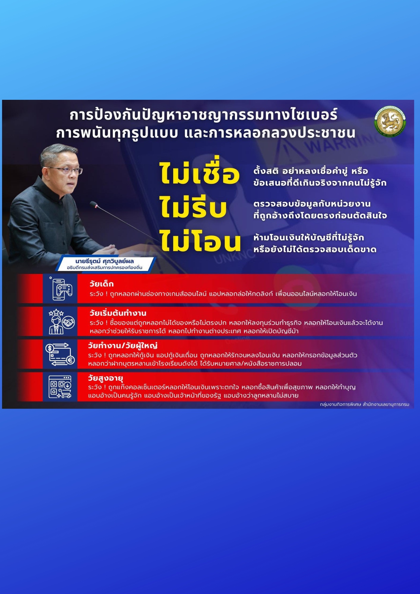 📢 องค์การบริหารส่วนตำบลวังม่วง ขอประชาสัมพันธ์เตือนภัยการหลอกลวงทางออนไลน์ (Scammer)